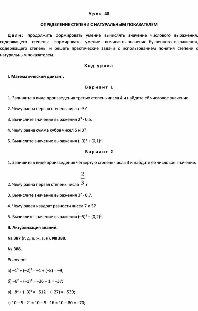 Цели: продолжить формировать умение вычислять значение числового выражения, содержащего степень; формировать умение вычислять значение буквенного выражения, содержащего степень, и решать практические задачи с использованием понятия степени с натуральным показателем.