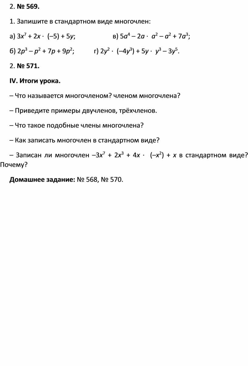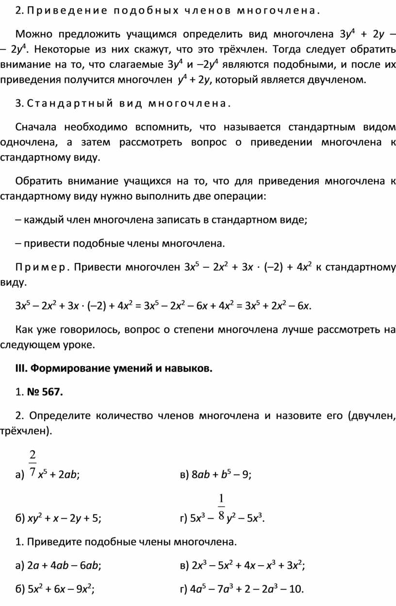 Обратить внимание учащихся на то, что для приведения многочлена к стандартному виду нужно выполнить две операции: