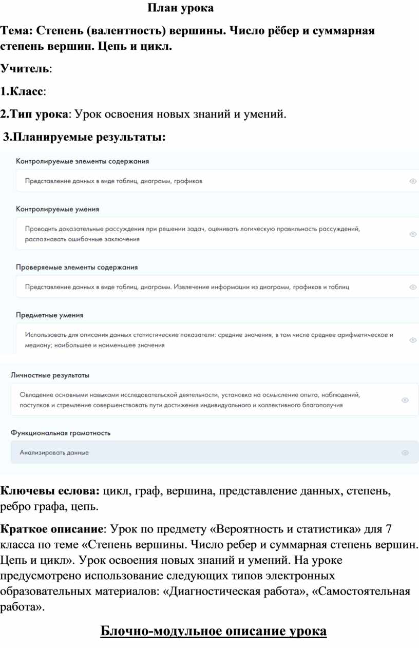 Краткое описание: Урок по предмету «Вероятность и статистика» для 7 класса по теме «Степень вершины. Число ребер и суммарная степень вершин. Цепь и цикл». Урок освоения новых знаний и умений. На уроке предусмотрено использование следующих типов электронных образовательных материалов: «Диагностическая работа», «Самостоятельная работа».