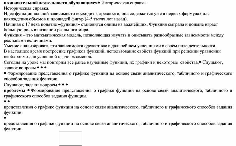 Историческая справка. Идея функциональной зависимости восходит к древности, она содержится уже в первых формулах для нахождения объемов и площадей фигур (4-5 тысяч лет назад). Начиная с 17 века понятие «функция» становится одним из важнейших. Функция сыграла и поныне играет большую роль в познании реального мира. Функция – это математическая модель, позволяющая изучать и описывать разнообразные зависимости между реальными величинами. Умение анализировать эти зависимости сделает вас в дальнейшем успешными в своем поле деятельности. В настоящее время построение графиков функций, использование свойств функций при решении уравнений необходимо для успешной сдачи экзаменов. Сегодня на уроке мы повторим все ранее изученные функции, их графики и некоторые свойства. |