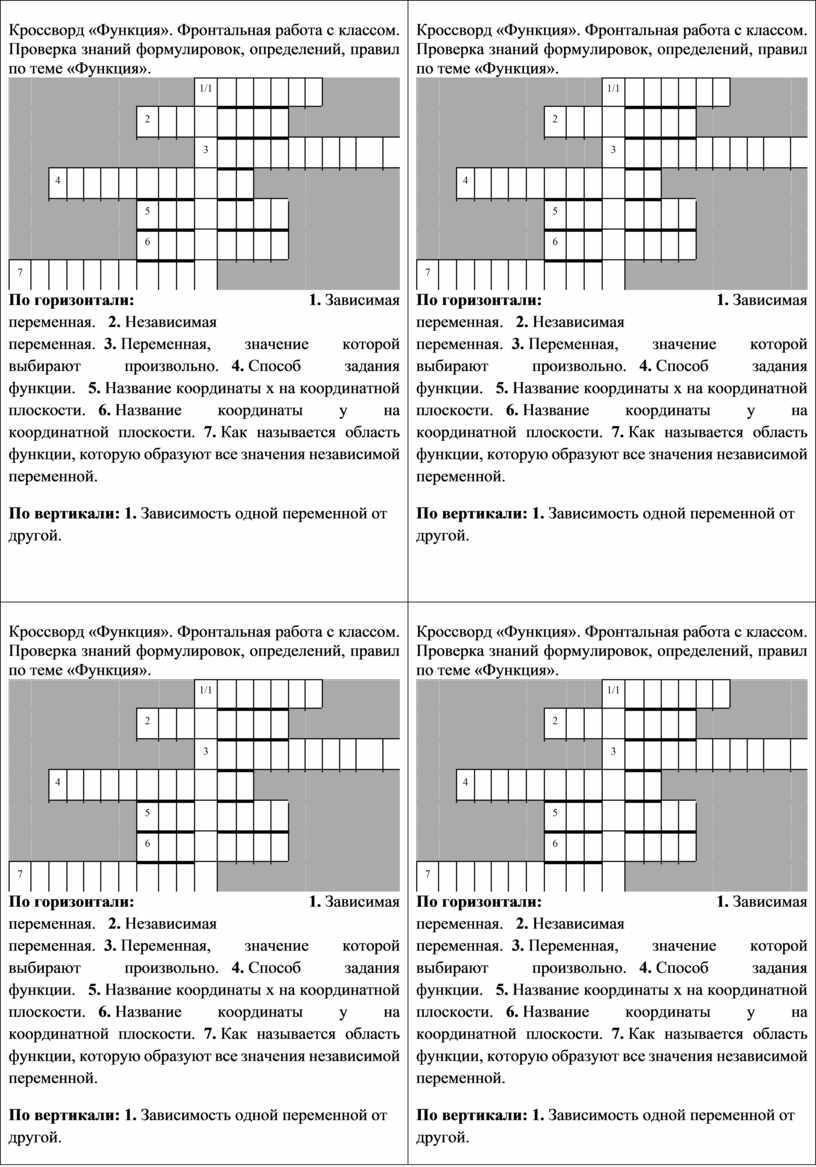 Кроссворд «Функция». Фронтальная работа с классом. Проверка знаний формулировок, определений, правил по теме «Функция».
