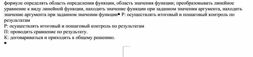 Познакомятся с понятиями: функция, независимая переменная (аргумент), зависимая переменная Научатся по формуле определять область определения функции, область значения функции; преобразовывать линейное уравнение к виду линейной функции, находить значение функции при заданном значении аргумента, находить значение аргумента при заданном значении функции |