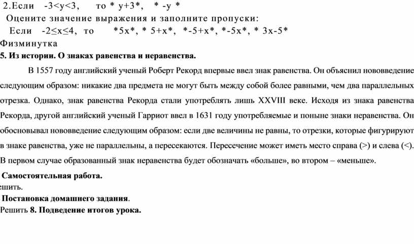 В 1557 году английский ученый Роберт Рекорд впервые ввел знак равенства. Он объяснил нововведение следующим образом: никакие два предмета не могут быть между собой более равными, чем два параллельных отрезка. Однако, знак равенства Рекорда стали употреблять лишь XXVIII веке. Исходя из знака равенства Рекорда, другой английский ученый Гарриот ввел в 1631 году употребляемые и поныне знаки неравенства. Он обосновывал нововведение следующим образом: если две величины не равны, то отрезки, которые фигурируют в знаке равенства, уже не параллельны, а пересекаются. Пересечение может иметь место справа (>) и слева (<). В первом случае образованный знак неравенства будет обозначать «больше», во втором – «меньше».