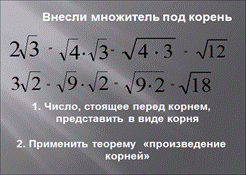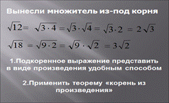 Тема урока: Вынесение множителя из-под знака корня.