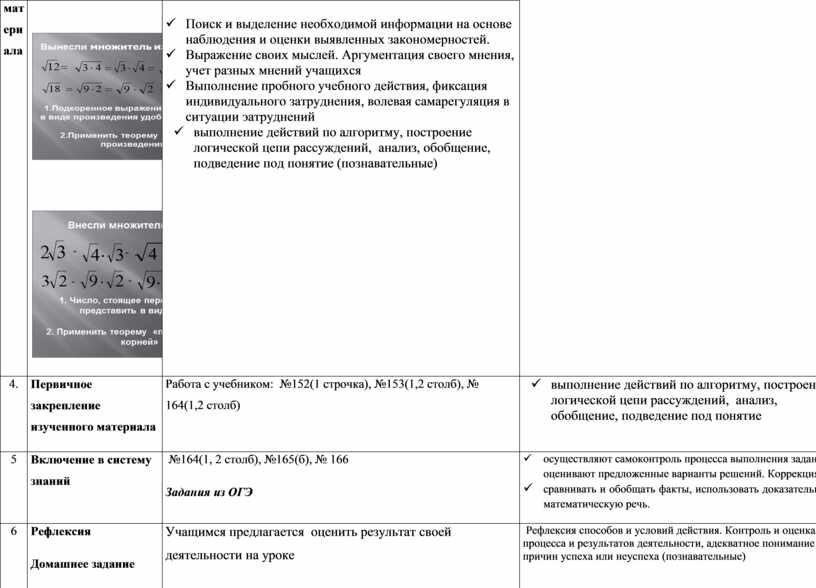 ü Поиск и выделение необходимой информации на основе наблюдения и оценки выявленных закономерностей. ü Выражение своих мыслей. Аргументация своего мнения, учет разных мнений учащихся ü Выполнение пробного учебного действия, фиксация индивидуального затруднения, волевая самарегуляция в ситуации эатруднений ü выполнение действий по алгоритму, построение логической цепи рассуждений, анализ, обобщение, подведение под понятие (познавательные)