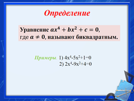 Записывают в тетради определение биквадратного уравнения. Задают вопросы, приводят примеры биквадратных уравнений.