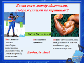 Учащиеся высказывают предложения. Учащиеся отвечают на вопрос учителя (на первой - биатлонист, на третьей - бицепс).