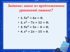 2. Учитель демонстрирует слайд №4, поясняет задание: изпредложенных уравнений выбрать лишнее. Учитель задает учащимся вопросы: 1. Как называется первое уравнение? Назовите способ решения. 2. Как называется второе и четвертое уравнение? Назовите способ решения.
