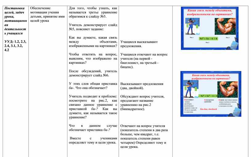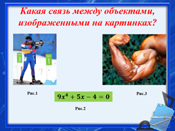 Для того, чтобы узнать, как называется третье уравнение обратимся к слайду №5. Учитель демонстрирует слайд №5, поясняет задание: Как вы думаете, какая связь между объектами, изображенными на картинках? Чтобы ответить на вопрос, выясним, что изображено на картинках? После обсуждений, учитель демонстрирует слайд №6. У этих слов общая приставка би-. Что она обозначает? Учитель подводит к проблеме: посмотрите на рис.2, как связано данное уравнение с приставкой би-? Как вы думаете, как называется такое уравнение? Что в данном случае обозначает приставка би-? Вместе с учениками определяет тему и цели урока. |