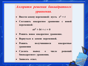 1. Какое уравнение называется биквадратным? Приведите примеры. 2. Сформулируйте алгоритм решения биквададратного уравнения. 3. Сколько корней может иметь биквадратное уравнение?