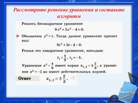 Учитель подводит итог обсуждений, демонстрирует слайд №9, на котором представлен алгоритм решения биквадратного уравнения, предлагает учащимся перенести его в тетрадь. |