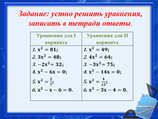 1. Учитель демонстрирует слайд №2, поясняет задание и организует работу учащихся. Устно решить уравнения, записав в тетради только ответы.