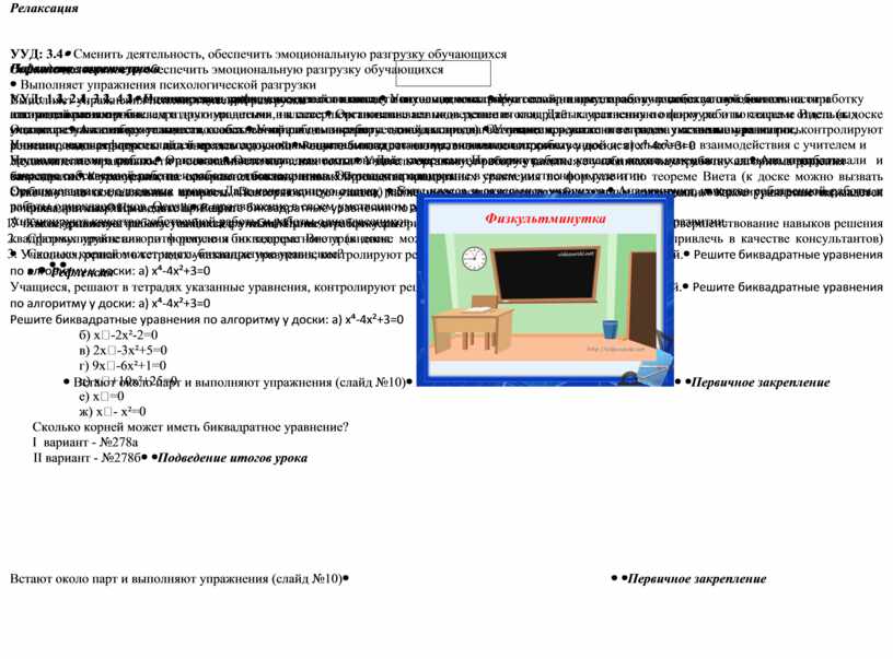 Учитель организует работу учащихся с учебником на отработку алгоритма решения биквадратного уравнения, на совершенствование навыков решения квадратных уравнения по формуле и по теореме Виета (к доске можно вызвать слабых учащихся, а сильных привлечь в качестве консультантов) |