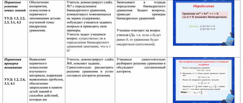 Учитель демонстрирует слайд №7 с определением биквадратного уравнения, комментирует появляющееся на экране содержание, побуждает учащихся задавать вопросы и приводить свои примеры. Учитель задает учащимся вопрос: существенно ли в определении биквадратного уравнения замечание, что а ≠ 0?