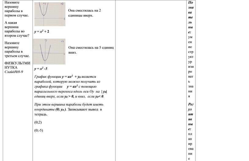 у = х2 -5 График функции у = ах2 + у0 является параболой, которую можно получить из графика функции у = ах2 с помощью параллельного переноса вдоль оси Оу на | у0| единиц вверх, если у0 > 0, и вниз, если у0< 0. При этом вершина параболы будет иметь координаты (0; у0 ). Записывают вывод в тетрадь. (0;2) (0;-5)