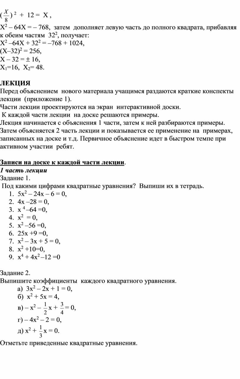 Х2 – 64Х = – 768, затем дополняет левую часть до полного квадрата, прибавляя к обеим частям 322, получает: