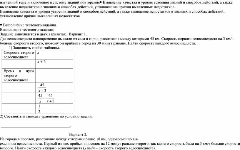 Выполнение тестового задания. Задание выполняется в двух вариантах. Вариант 1. Два велосипедиста одновременно выехали из села в город, расстояние между которыми 45 км. Скорость первого велосипедиста на 3 км/ч больше скорости второго, поэтому он прибыл в город на 30 минут раньше. Найти скорость каждого велосипедиста. 1) Заполнить ячейки таблицы.
