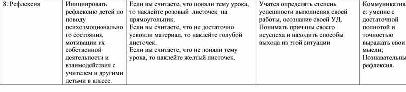 Инициировать рефлексию детей по поводу психоэмоционального состояния, мотивации их собственной деятельности и взаимодействия с учителем и другими детьми в классе. |