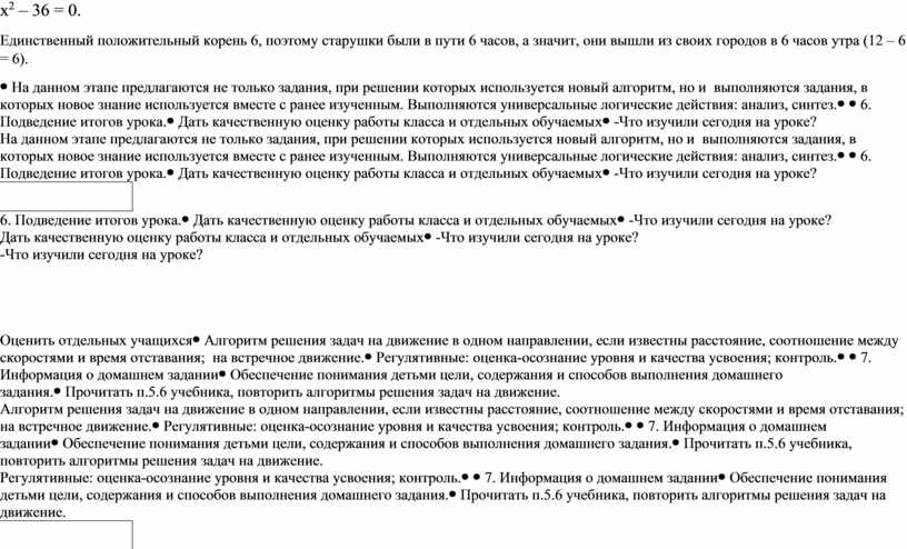 х2 – 36 = 0. Единственный положительный корень 6, поэтому старушки были в пути 6 часов, а значит, они вышли из своих городов в 6 часов утра (12 – 6 = 6).