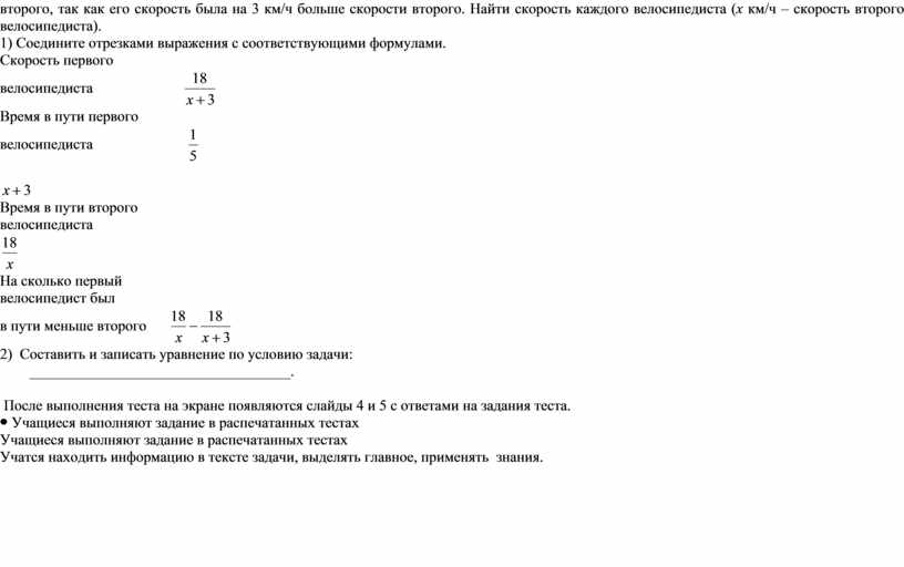 Вариант 2. Из города в поселок, расстояние между которыми равно 18 км, одновременно вы- ехали два велосипедиста. Первый из них прибыл в поселок на 12 минут раньше второго, так как его скорость была на 3 км/ч больше скорости второго. Найти скорость каждого велосипедиста (х км/ч – скорость второго велосипедиста). 1) Соедините отрезками выражения с соответствующими формулами. Скорость первого велосипедиста