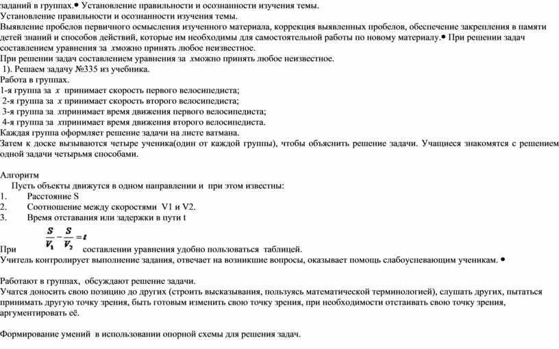 При решении задач составлением уравнения за хможно принять любое неизвестное. 1). Решаем задачу №335 из учебника. Работа в группах. 1-я группа за х принимает скорость первого велосипедиста; 2-я группа за х принимает скорость второго велосипедиста; 3-я группа за хпринимает время движения первого велосипедиста; 4-я группа за хпринимает время движения второго велосипедиста. Каждая группа оформляет решение задачи на листе ватмана. Затем к доске вызываются четыре ученика(один от каждой группы), чтобы объяснить решение задачи. Учащиеся знакомятся с решением одной задачи четырьмя способами.