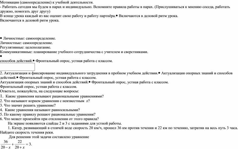 Фронтальный опрос, устная работа с классом. Ответьте, пожалуйста, на следующие вопросы: 1. Какие уравнения называют рациональными уравнениями? 2. Что называют корнем уравнения с неизвестным х? 3. Что значит решить уравнение? 4. Какие уравнения называют равносильными? 5. По какому правилу решают рациональные уравнения? 6. Что может произойти при отклонении от этого правила? На экране появляются слайды 2 и 3 с заданиями для устной работы. 1. Катер, развивающий в стоячей воде скорость 20 км/ч, прошел 36 км против течения и 22 км по течению, затратив на весь путь 3 часа. Найдите скорость течения реки. Для решения этой задачи составлено уравнение