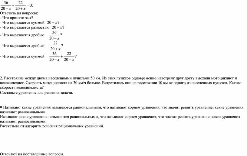 2. Расстояние между двумя населенными пунктами 50 км. Из этих пунктов одновременно навстречу друг другу выехали мотоциклист и велосипедист. Скорость мотоциклиста на 30 км/ч больше. Встретились они на расстоянии 10 км от одного из населенных пунктов. Какова скорость велосипедиста? Составьте уравнение для решения