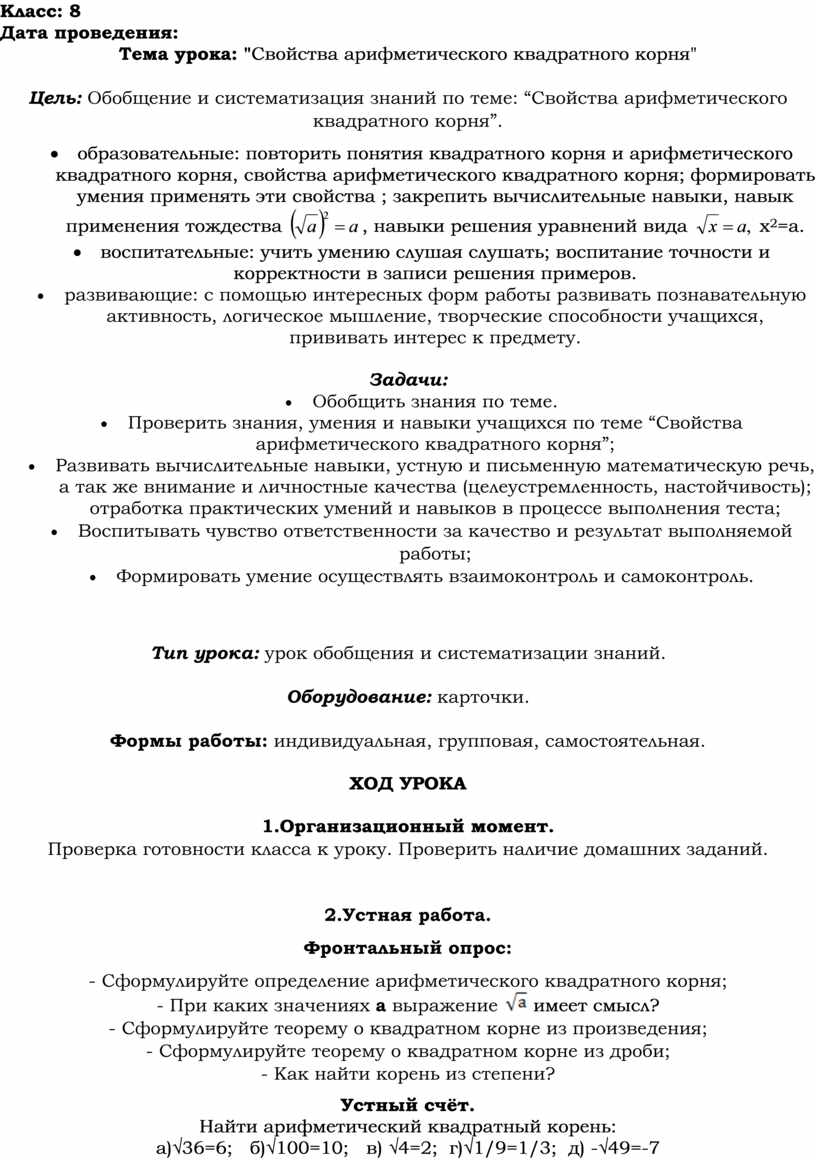 Цель: Обобщение и систематизация знаний по теме: “Свойства арифметического квадратного корня”.
