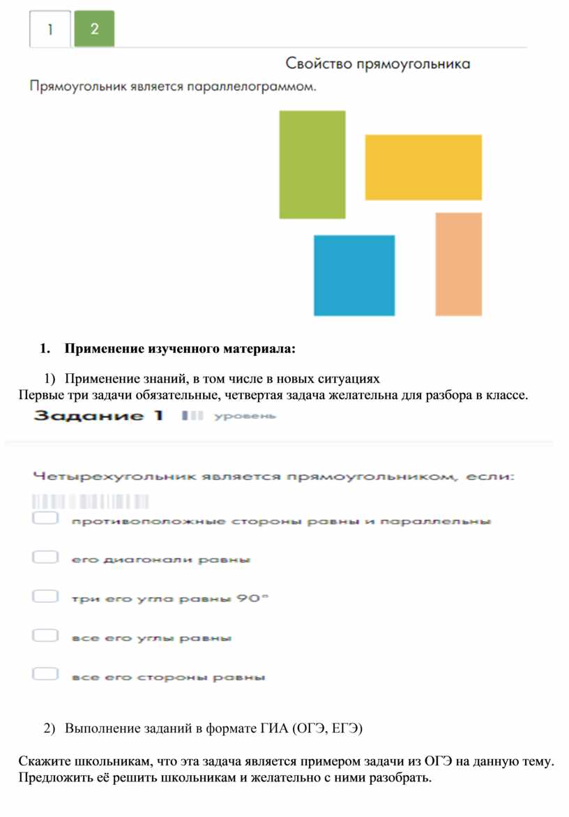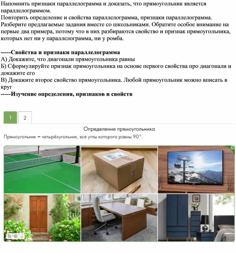 Разберите предлагаемые задания вместе со школьниками. Обратите особое внимание на первые два примера, потому что в них разбираются свойство и признак прямоугольника, которых нет ни у параллелограмма, ни у ромба.