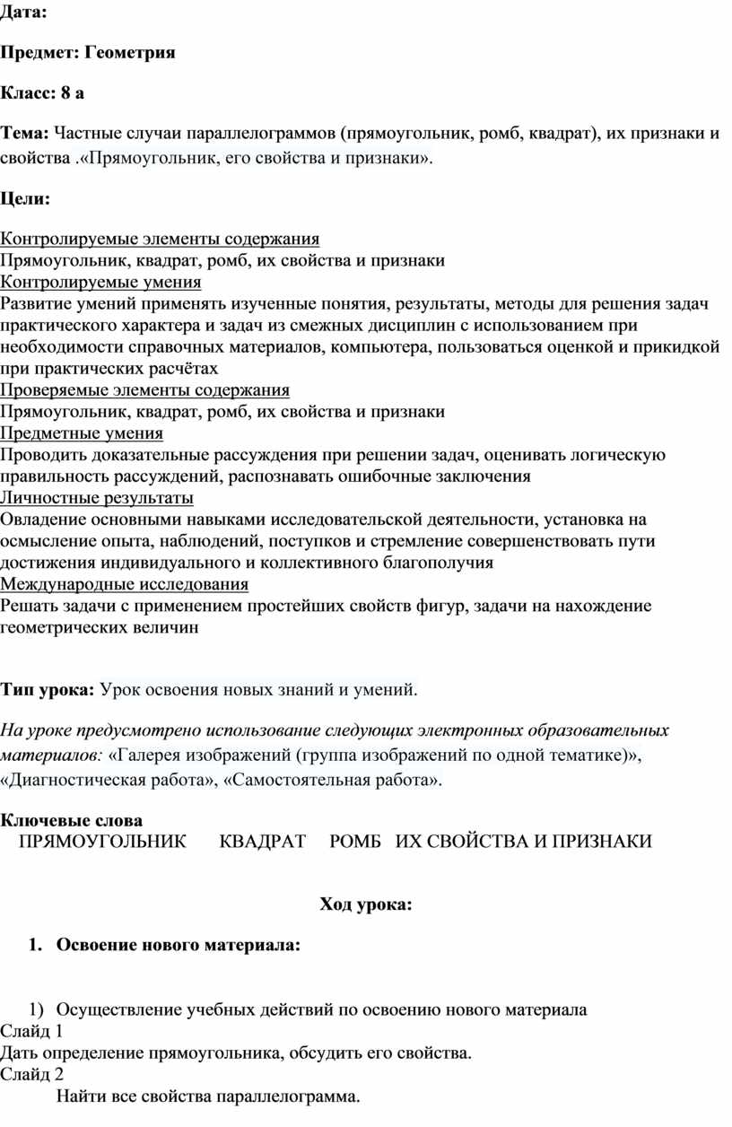 Тема: Частные случаи параллелограммов (прямоугольник, ромб, квадрат), их признаки и свойства .«Прямоугольник, его свойства и признаки».