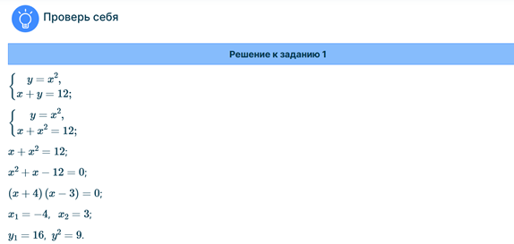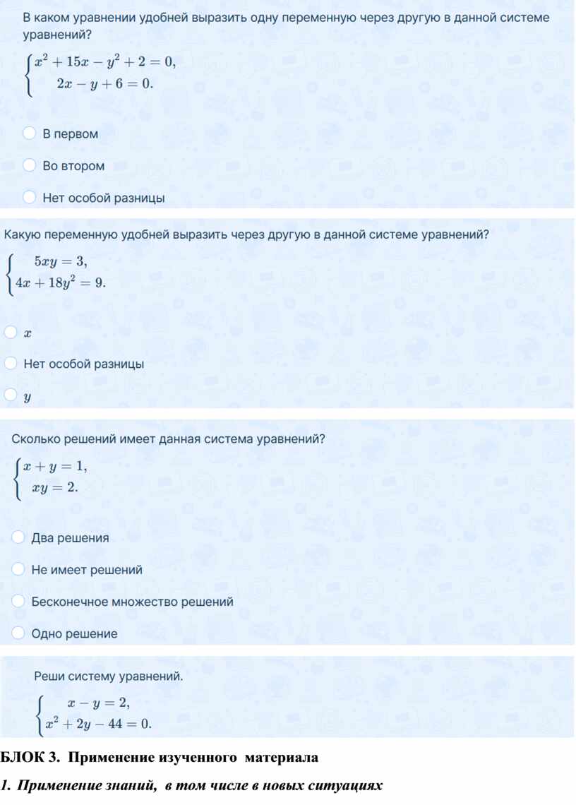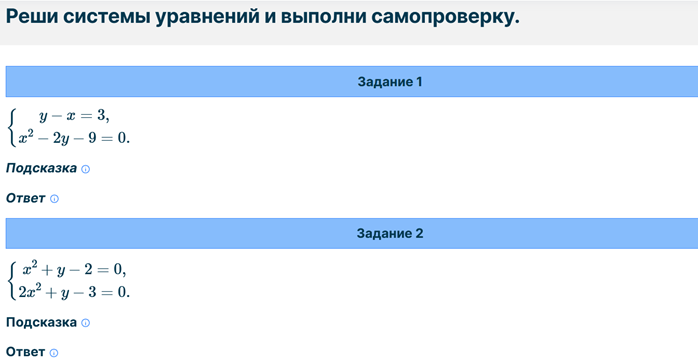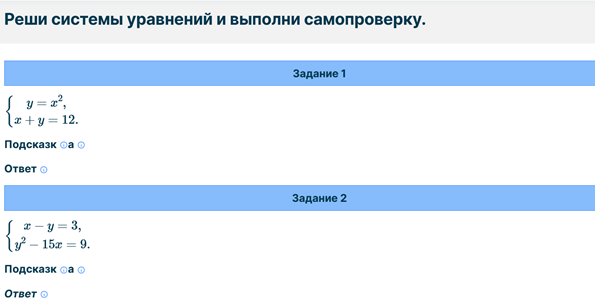 Краткое описание: Урок по предмету «Алгебра» для 9 класса по теме «Решение систем двух уравнений, одно из которых линейное, а другое — второй степени». Комбинированный урок. На уроке предусмотрено использование следующих типов электронных образовательных материалов: «Диагностическая работа», «Инструкция по выполнению практической работы», «Кейсы по работе с информацией», «Самостоятельная работа».
