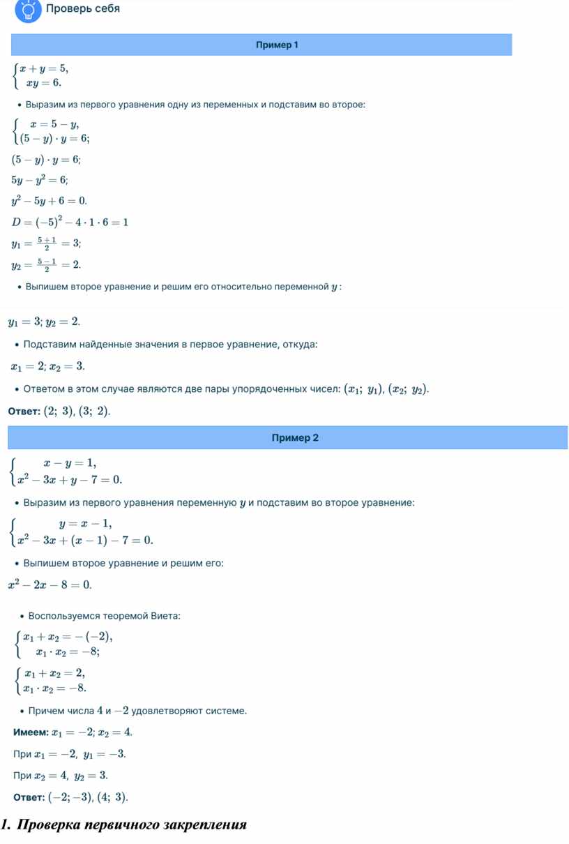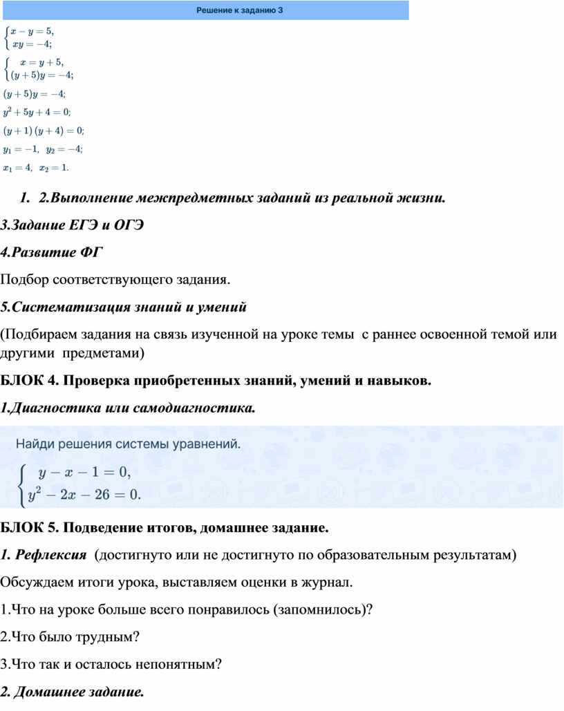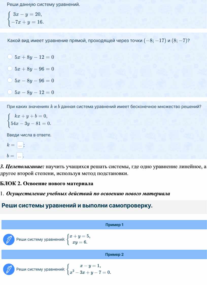 3. Целеполагание: научить учащихся решать системы, где одно уравнение линейное, а другое второй степени, используя метод подстановки.