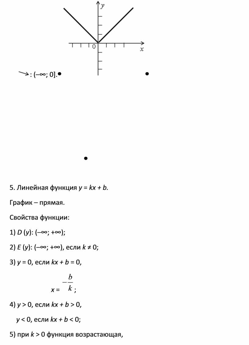 5. Линейная функция у = kx + b. График – прямая. Свойства функции: 1) D (у): (–∞; +∞); 2) Е (у): (–∞; +∞), если k ≠ 0; 3) у = 0, если kx + b = 0, х