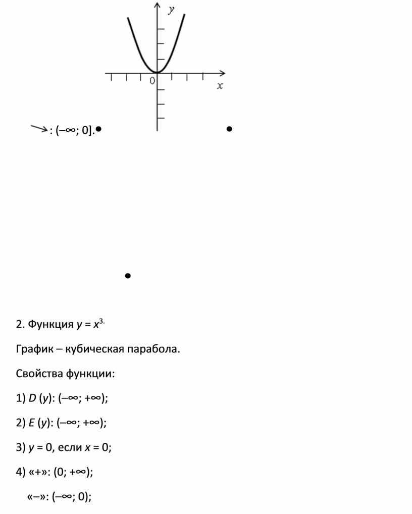 1. Функция у = х2. График – парабола. Свойства функции: 1) D (у): (–∞; +∞); 2) Е (у): [0; +∞]; 3) у = 0, если х = 0; 4) «+»: (–∞; 0) 5) |