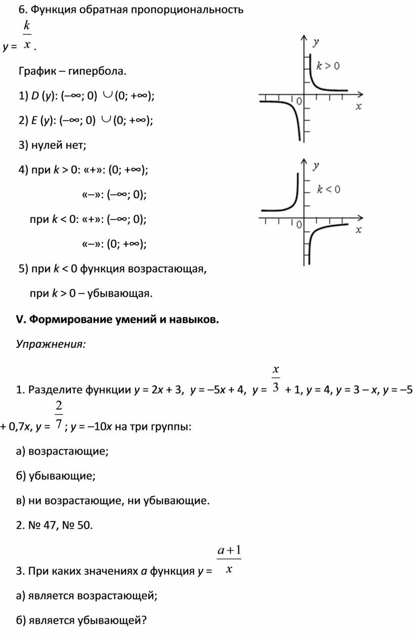 0) 3) нулей нет; 4) при k > 0: «+»: (0; +∞); «–»: (–∞; 0); при k < 0: «+»: (–∞; 0); «–»: (0; +∞); 5) при k < 0 функция возрастающая, при k > 0 – убывающая. |