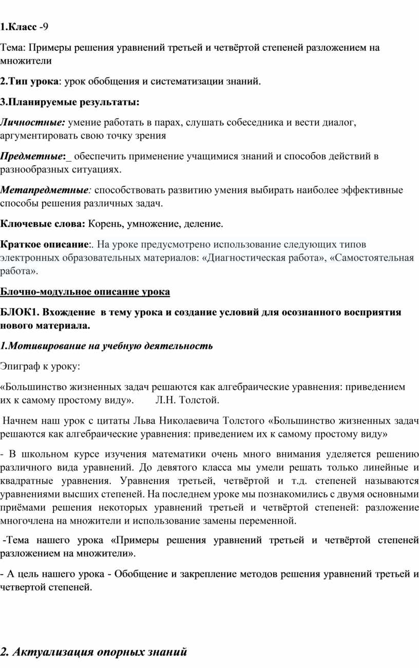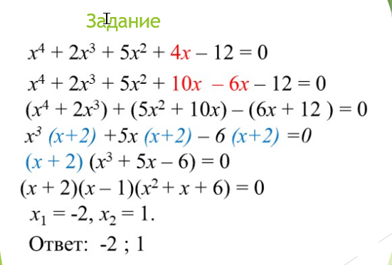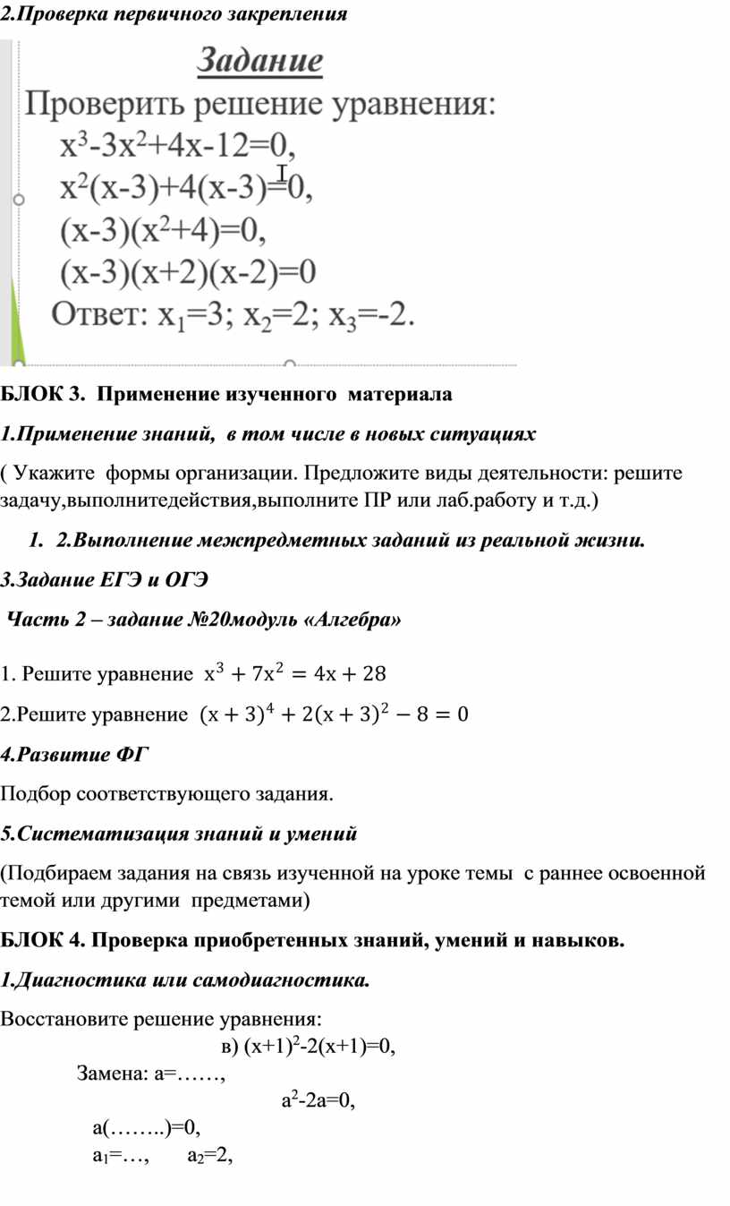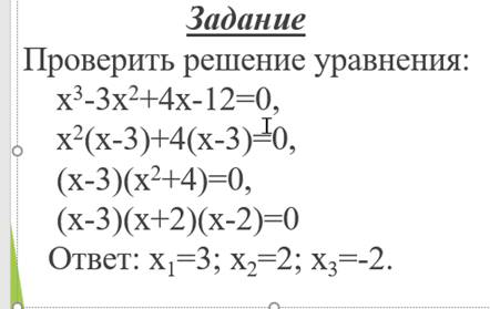 Тема: Примеры решения уравнений третьей и четвёртой степеней разложением на множители