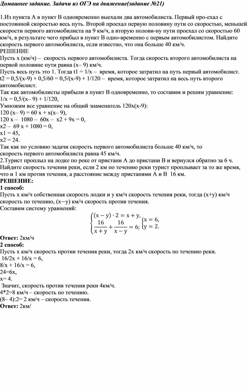 Домашнее задание. Задачи из ОГЭ на движение(задание №21)