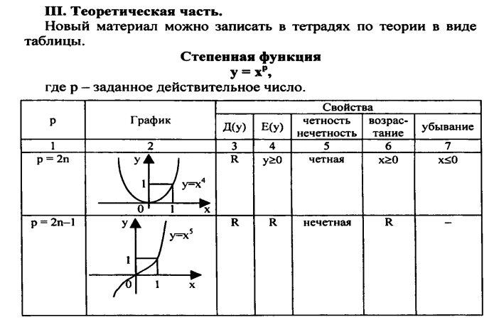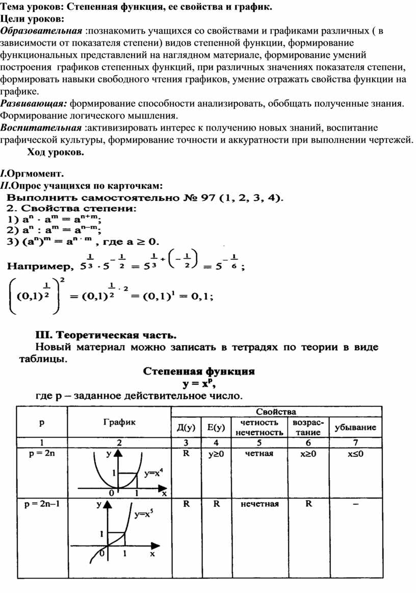 Тема уроков: Степенная функция, ее свойства и график.