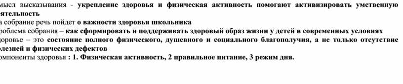 Смысл высказывания - укрепление здоровья и физическая активность помогают активизировать умственную деятельность