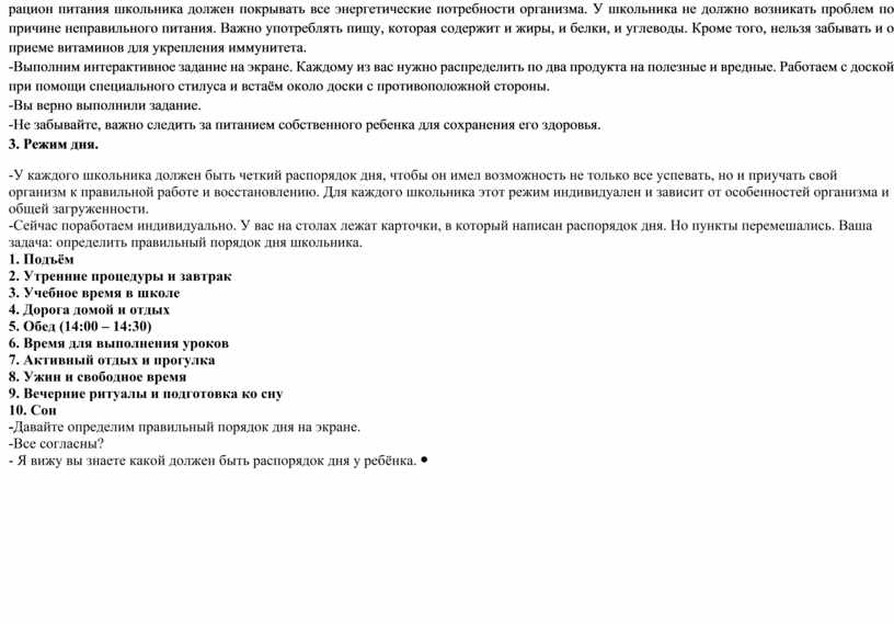 - Я предлагаю выполнить парную работу. Я даю каждой паре задание – показать одно упражнения, которое вы используете или во всяком случае должны использовать при приготовлении домашнего задания. 1-ая пара – показать одно упражнение для глаз 2-ая пара – показать 1 упражнение на осанку 3-ая пара – показать одно дыхательное упражнение или упражнение на расслабление - Первая пара, пожалуйста выйдите и покажите ваше упражнение. Аккуратнее, провода. -Уважаемые родители, спасибо вам большое за упражнения. У нас получилась физ. минутка, которую можно использовать при подготовке домашнего задания. 2. Правильное питание. - Мария Кардакова, врач-диетолог, в своей книге «С начала суп, потом десерт» определяет главную причину нарушения в состоянии здоровья, вызванную ошибками питания. В школьный период у подростков происходит гормональная перестройка организма и ускоряется процесс роста. Поэтому рацион питания школьника должен покрывать все энергетические потребности организма. У школьника не должно возникать проблем по причине неправильного питания. Важно употреблять пищу, которая содержит и жиры, и белки, и углеводы. Кроме того, нельзя забывать и о приеме витаминов для укрепления иммунитета. -Выполним интерактивное задание на экране. Каждому из вас нужно распределить по два продукта на полезные и вредные. Работаем с доской при помощи специального стилуса и встаём около доски с противоположной стороны. -Вы верно выполнили задание. -Не забывайте, важно следить за питанием собственного ребенка для сохранения его здоровья. 3. Режим дня. -У каждого школьника должен быть четкий распорядок дня, чтобы он имел возможность не только все успевать, но и приучать свой организм к правильной работе и восстановлению. Для каждого школьника этот режим индивидуален и зависит от особенностей организма и общей загруженности. -Сейчас поработаем индивидуально. У вас на столах лежат карточки, в который написан распорядок дня. Но пункты перемешались. Ваша задача: определить правильный порядок дня школьника. 1. Подъём 2. Утренние процедуры и завтрак 3. Учебное время в школе 4. Дорога домой и отдых 5. Обед (14:00 – 14:30) 6. Время для выполнения уроков 7. Активный отдых и прогулка 8. Ужин и свободное время 9. Вечерние ритуалы и подготовка ко сну 10. Сон -Давайте определим правильный порядок дня на экране. -Все согласны? - Я вижу вы знаете какой должен быть распорядок дня у ребёнка. |