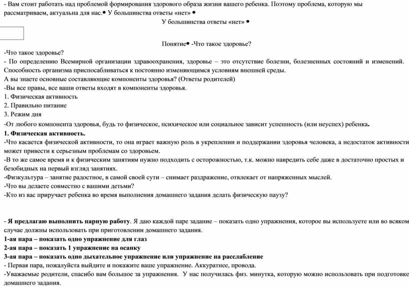 -Что такое здоровье? - По определению Всемирной организации здравоохранения, здоровье – это отсутствие болезни, болезненных состояний и изменений. Способность организма приспосабливаться к постоянно изменяющимся условиям внешней среды. А вы знаете основные составляющие компоненты здоровья? (Ответы родителей) -Вы все правы, все ваши ответы входят в компоненты здоровья. 1. Физическая активность 2. Правильно питание 3. Режим дня -От любого компонента здоровья, будь то физическое, психическое или социальное зависит успешность (или неуспех) ребенка. 1. Физическая активность. -Что касается физической активности, то она играет важную роль в укреплении и поддержании здоровья человека, а недостаток активности может привести к серьезным проблемам со здоровьем. -В то же самое время и к физическим занятиям нужно подходить с осторожностью, т.к. можно навредить себе даже в достаточно простых и безобидных на первый взгляд занятиях. -Физкультура – занятие радостное, в самой своей сути – снимает раздражение, отвлекает от напряженных мыслей. -Что вы делаете совместно с вашими детьми? -Кто из вас приручает ребенка во время выполнения домашнего задания делать физическую паузу?