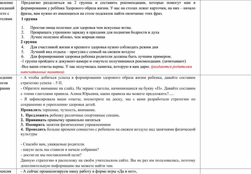 Составление рекомендаций вместе с родителями |