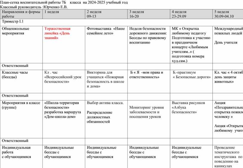 План-сетка воспитательной работы 7Б класса на 2024-2025 учебный год