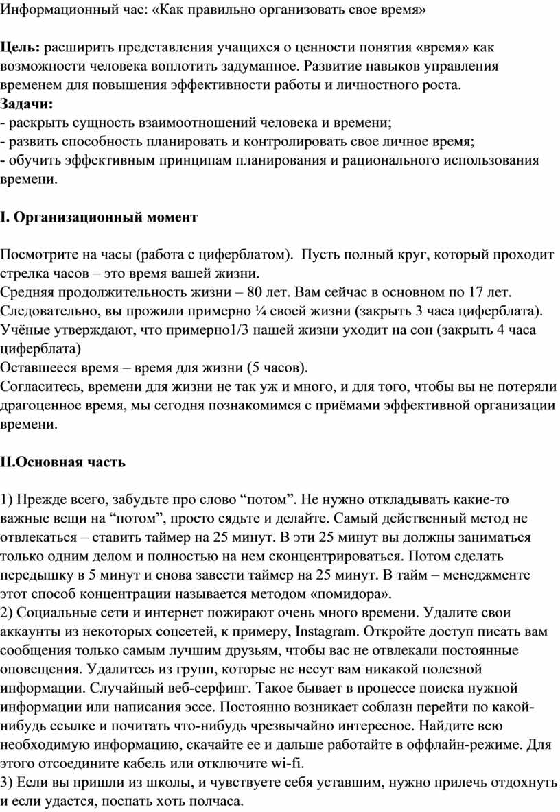 Цель: расширить представления учащихся о ценности понятия «время» как возможности человека воплотить задуманное. Развитие навыков управления временем для повышения эффективности работы и личностного роста.