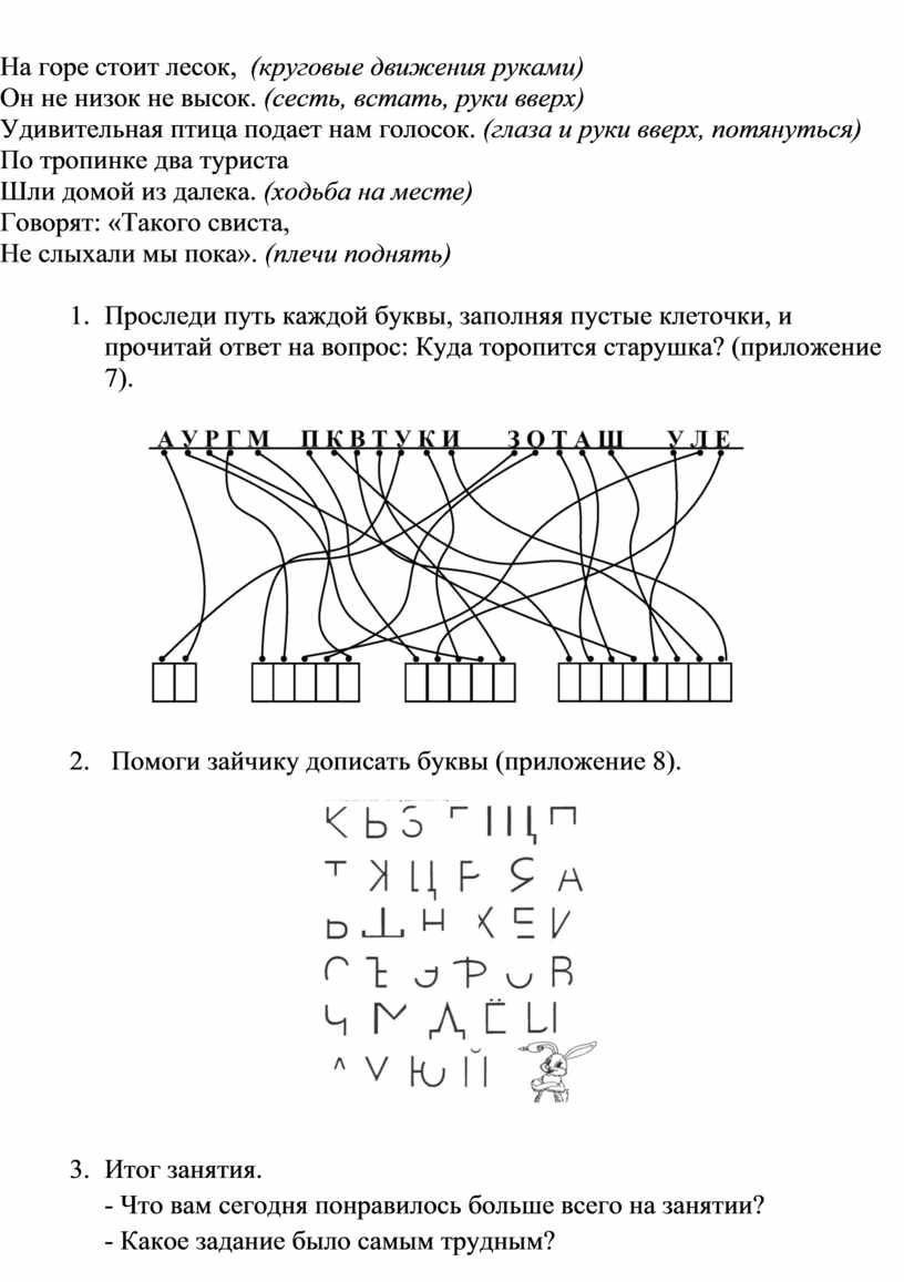 11. Проследи путь каждой буквы, заполняя пустые клеточки, и прочитай ответ на вопрос: Куда торопится старушка? (приложение 7).