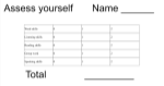 During our lesson you should put marks for different tasks. Write your names. You`ll assess yourself for words, listening skills, reading skills, group work and spealing skills. You can put from zero to two. At the end of the lesson you`ll count all points and get your result for the lesson. |