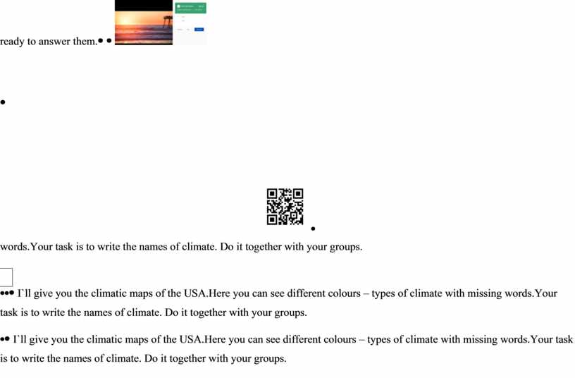 I`ll give you the climatic maps of the USA.Here you can see different colours – types of climate with missing words.Your task is to write the names of climate. Do it together with your groups. Are you ready? Let`s check up. How many types of climate does the USA have? Were you right or not? |