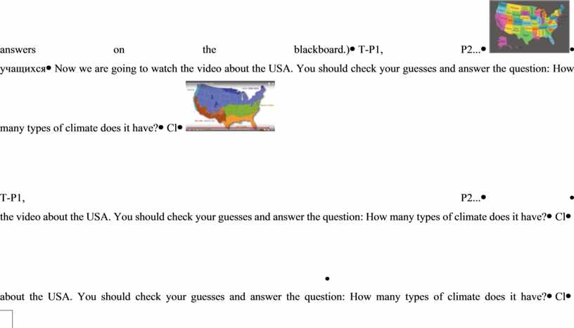You know that the USA is a country of a huge size. What is the capital of the country? Do you know how many states does it have? Can you name some of them? Do you know how many types of climate does it have? Two? Three? Four? How do you think? (Put the answers on the blackboard.) |