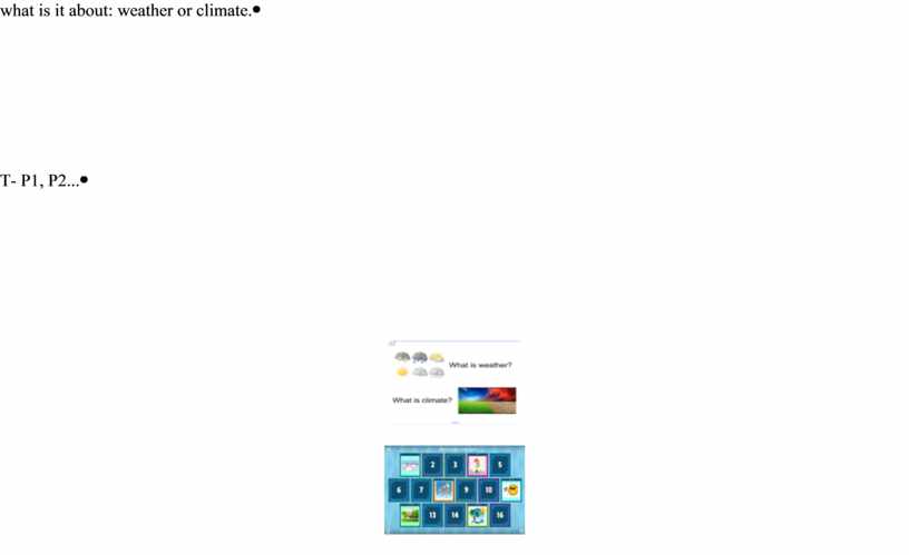 To speak about weather and climate we should revise some words. What is weather? What is climate? Look at the board and tell me what can you see and what is it about: weather or climate. |