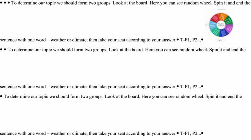 To determine our topic we should form two groups. Look at the board. Here you can see random wheel. Spin it and end the sentence with one word – weather or climate, then take your seat according to your answer. |